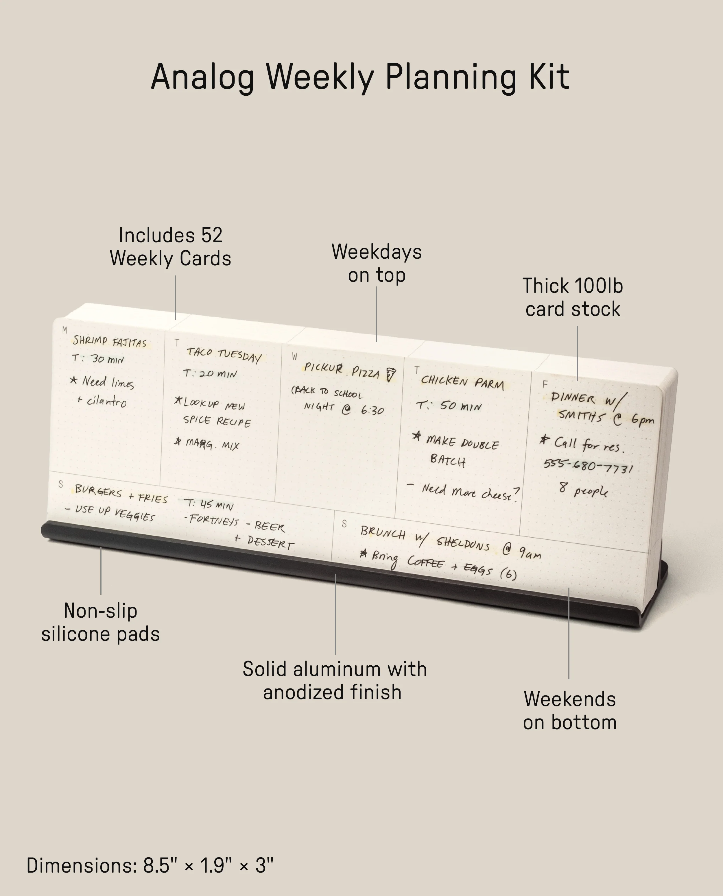Each kit includes 52 Weekly Cards (enough for a full year) printed on thick 100lb cardstock with a subtle dot grid pattern, paired with a machined aluminum card stand with a non-slip silicone pad. When the week is over, place the completed card in the back of the stack and start fresh.