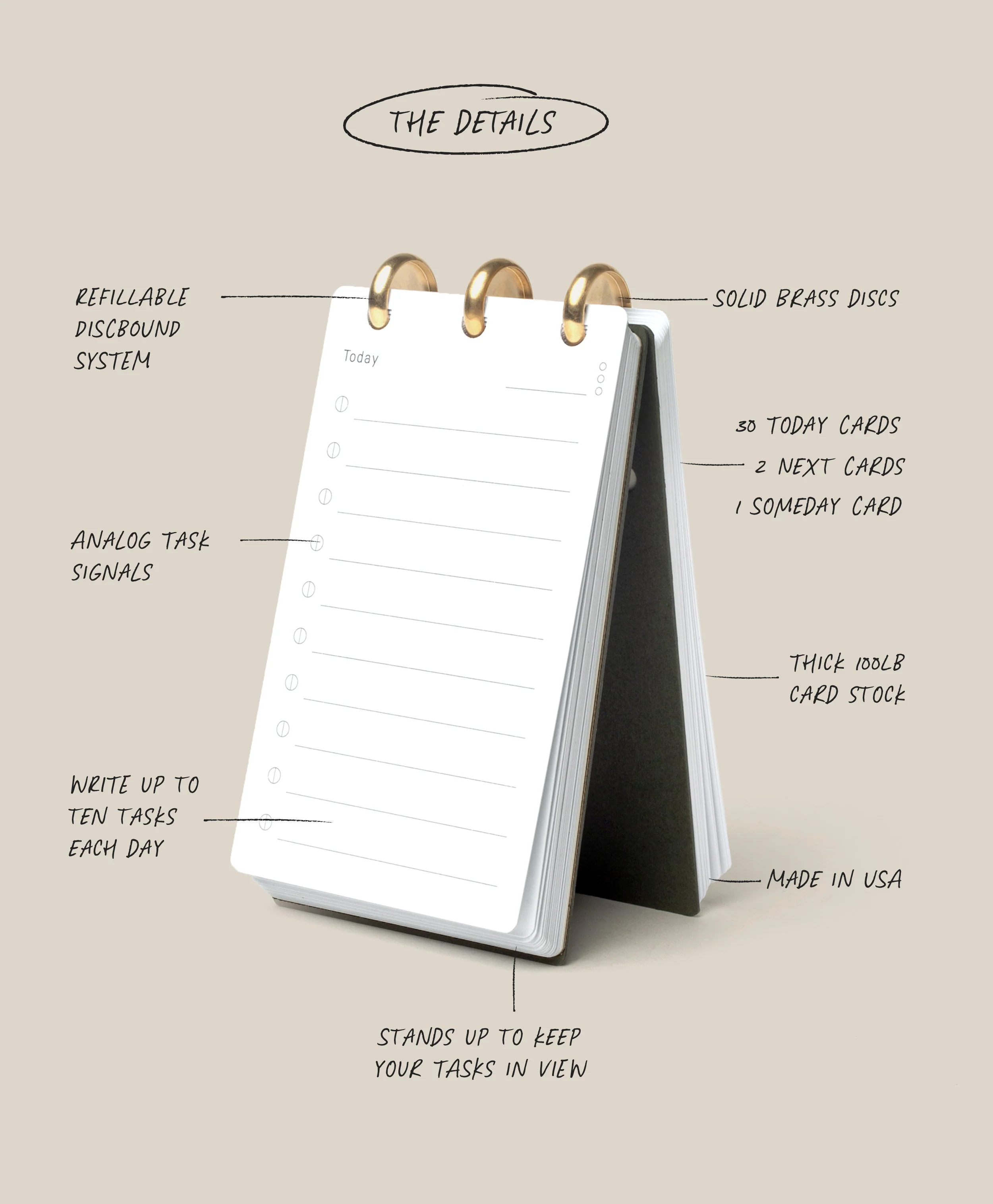 This new discbound version of our best-selling Analog System™ combines the portability of a notepad with the freedom to refill and rearrange the cards over time. The 3″x5″ cards are connected with 3 solid brass discs and protected by thick card stock covers.