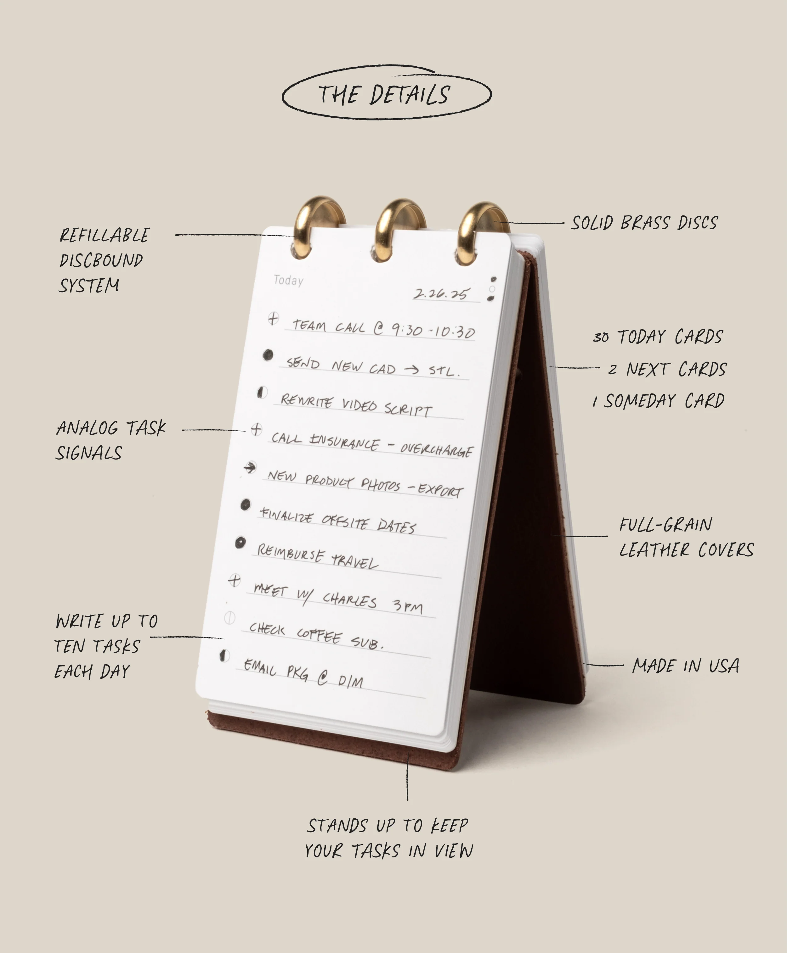 Featuring full-grain leather covers that develop character over time and the 3 solid brass discs give you the freedom to remove, add, and reorganize the cards. Includes one month of Analog Task Cards (33 cards).