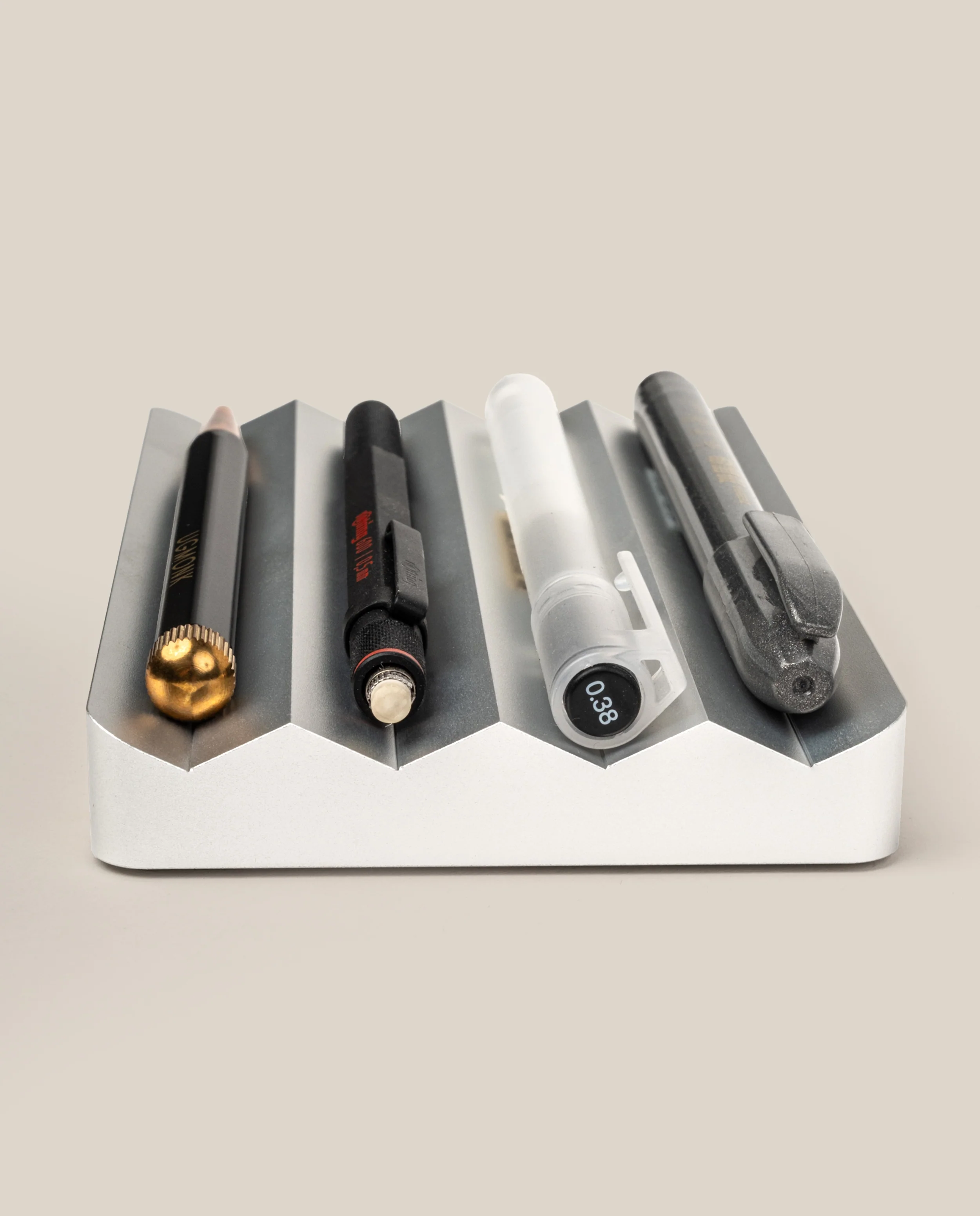 A beautiful home for your favorite pens so they are always within reach. The Multi Pen Tray holds up to four pens in a zigzag channel milled from solid aluminum with an anodized finish. Non-slip silicone pads on the bottom keep it firmly in place on your desk.